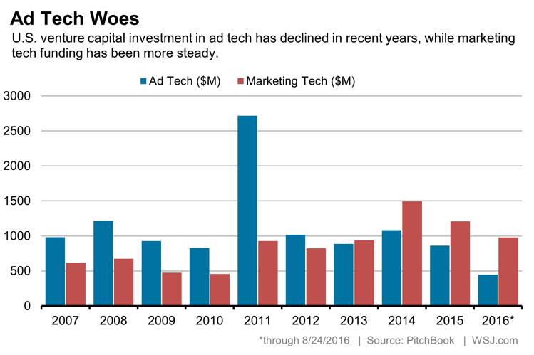 U.S. venture-capital firms invested around $860 million in ad tech firms last year, the lowest amount since 2010 and down considerably from a peak of more than $2.7 billion in 2011, according to venture capital and private equity data company PitchBook. So far this year, only $446 million has been committed, on pace for the lowest funding level since 2005.
