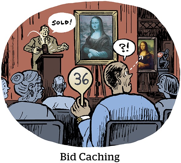 An auction caching occurs when a lost bid from one auction is used to fill a subsequent auction – without the buyer knowing, and with slightly different ad targeting information.