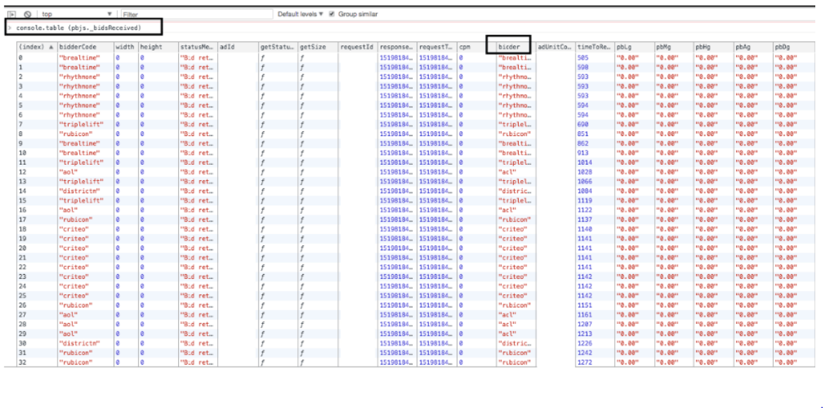 This is as easy as going to the console and typing ‘console.table (pbjs._bidsReceived)‘ to get a high level information of the bids