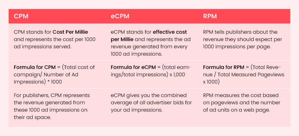 We hope by now you have a clear understanding of what eCPM is and how is eCPM calculated. Let’s now have a look at how it differs from CPM and RPM.