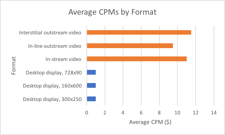 Chart 3: Video ads have much higher CPM rates as compared to display ads, here are the rates for three video formats compared to display ad CPMs across a common SSP.
