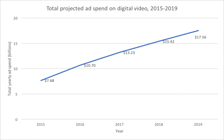 Chart 2: Digital video ad spend is rising annually, growing 39% from $7.68 billion in 2015 to $10.7 billion in 2016. Analysts believe that number could be over $15 billion by 2018.
