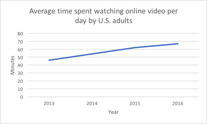 Chart 1: eMarketer recently reported that the average U.S. adult now watches one hour and seven minutes of digital video a day, compared to 46 minutes in 2013.