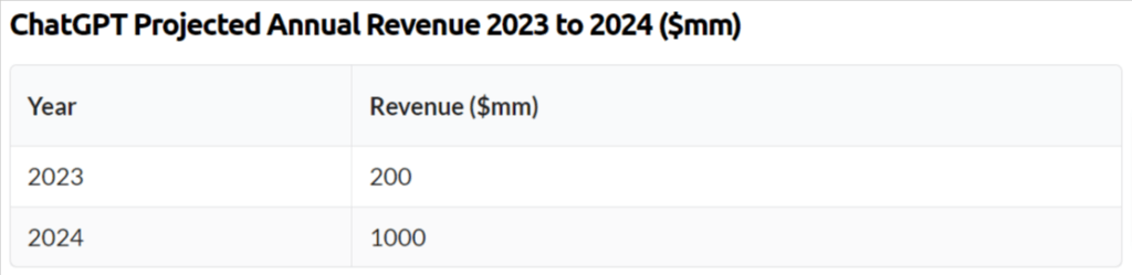 - OpenAI has projected revenues of $200 million for 2023 and $1 billion by 2024.