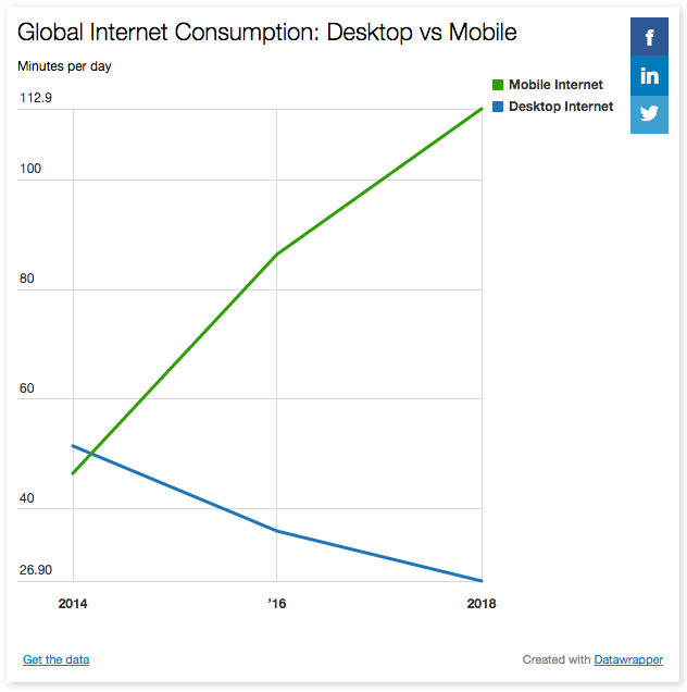 No surprises here, ad spend on mobile as a channel is growing at an unprecedented rate, which makes sense because that’s where most of us spend a majority of our time now, a point driven home by this chart on global internet consumption by device.